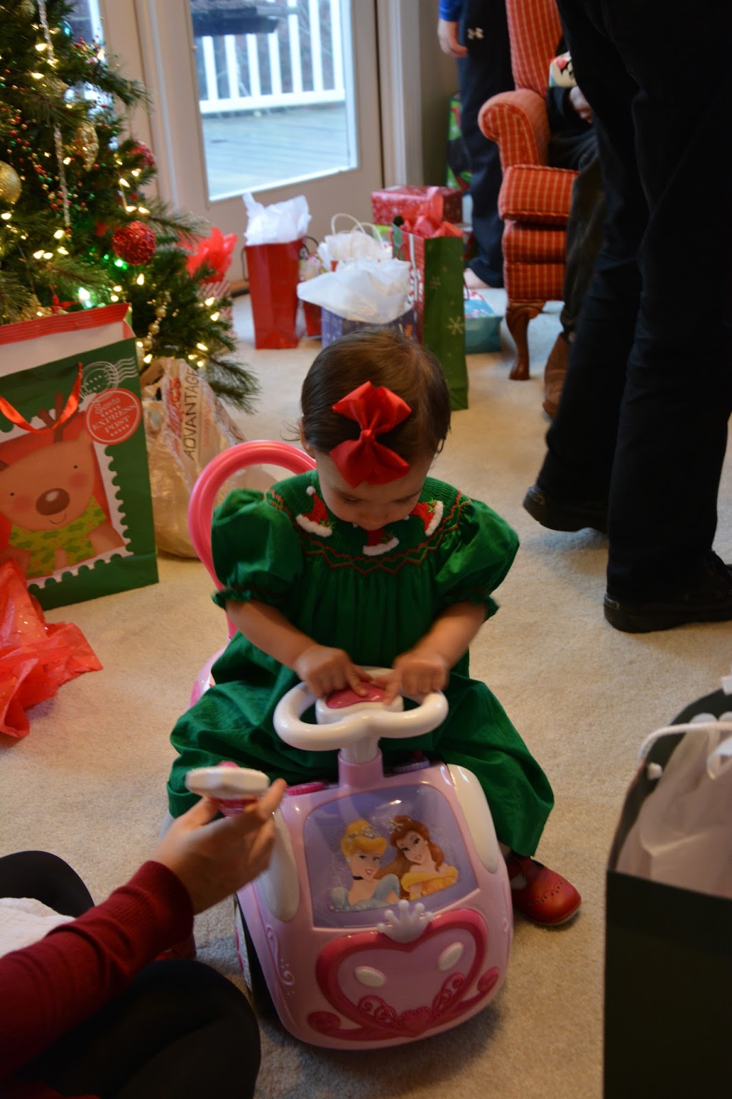 Sleep: She has been sleeping great at night!! As far as naps, we have been bouncing back and forth between 1 and 2 naps a day. She is ready to transition to one nap and we did this for a week or so, but then with all the Christmas activities, we switched back to two naps so she could last longer at night. With one nap she is ready for bed no later than 7pm, and with two naps over the week of Christmas she was still partying until 9pm most nights. Poor thing on Christmas morning slept in until 8:30am haha!! She had no desire to see what Santa had brought her... she was just exhausted from the days leading up to Christmas. Christmas day she took a nap in the car riding to my grandparents' house and then that afternoon she slept from 3pm until 6:30pm. We had to have a shortened late Christmas at my parents house because little girl was wiped out from the Christmas fun :)